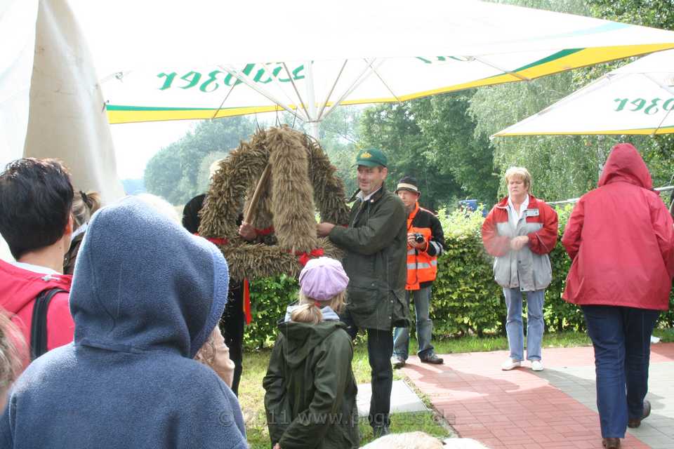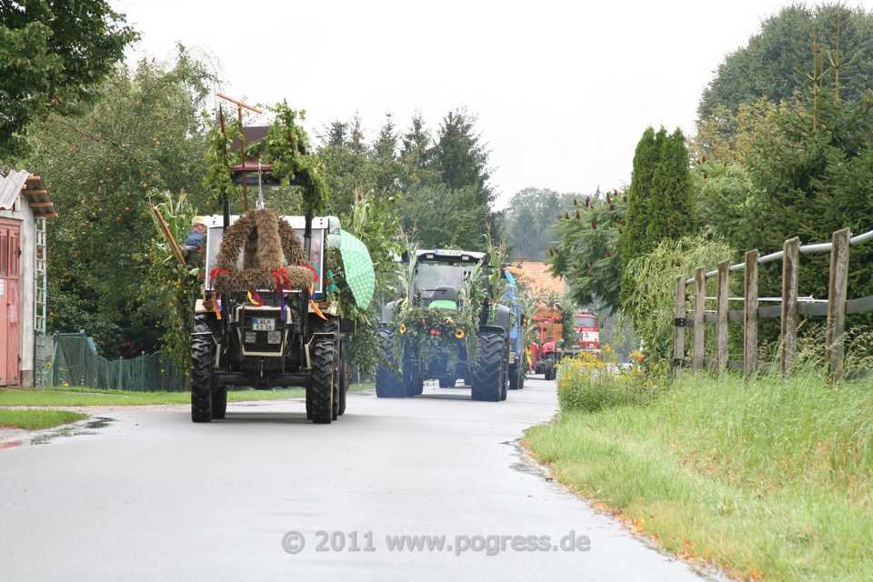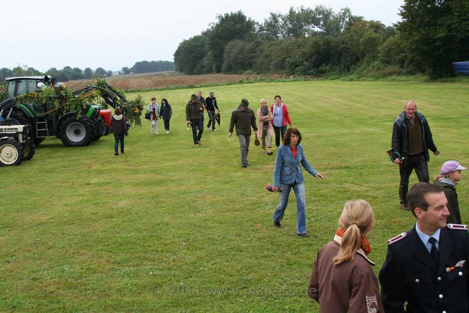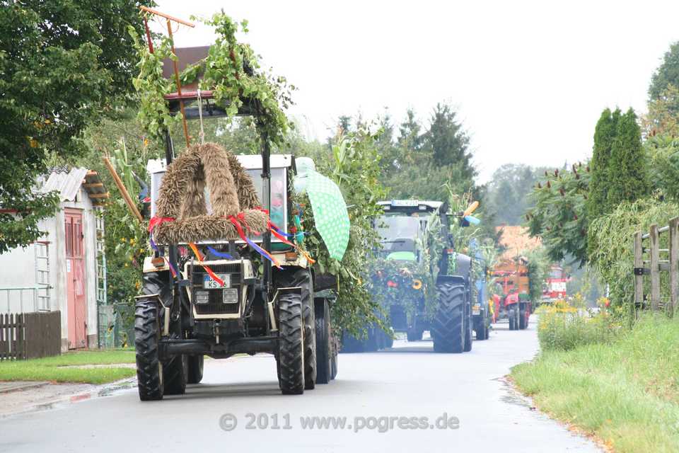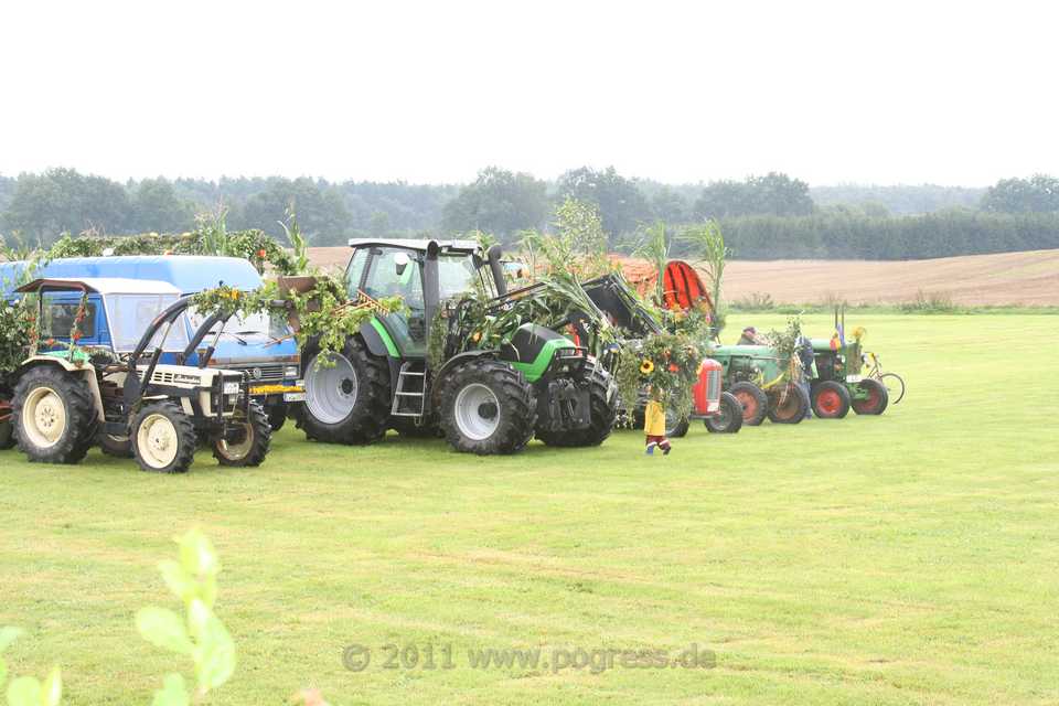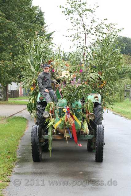 Am Ortsausgang Dümmer Weg, direkt am Wald, setzte sich der Zug angeführt von einem Traktor mit der Erntekrone in Bewegung. Es folgten mehrere schön geschmückte Traktoren, die ebenfalls schön geschmückte Erntewagen zogen. Auf den Erntewagen saßen viele Pogreßer und Gäste, die trotz zeitweise starkem Regen bester Stimmung waren und einen wirklich schönen Umzug erlebten.